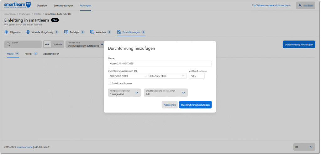 Im Reiter «Durchführungen» auf Piloten oder Varianten können neue Durchführungen verwaltet werden. Als Durchführung wird die Austeilung einer Prüfung oder Lernumgebung an Teilnehmende zu einem bestimmten Zeitpunkt bezeichnet.