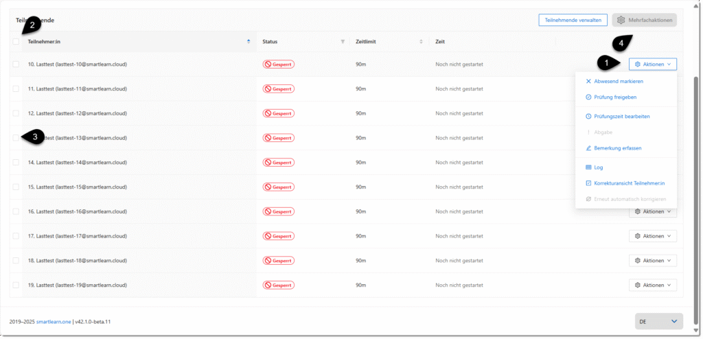 Nach dem Speichern erscheinen die Teilnehmenden in der Liste direkt im Cockpit. Hier können diese mittels Aktionen (1) einzeln bearbeitet werden. Über den Mehrfachauswahl (2 oder 3) und die Mehrfachaktionen (4) können auch mehrere Aktionen auf einmal durchgeführt werden.
