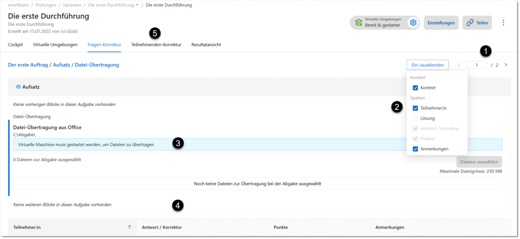 3 | Hier kann die Korrektur der jeweiligen Aufgabe bestätigt werden, sofern die Korrektur durch mehrere Personen aktiviert wurde |