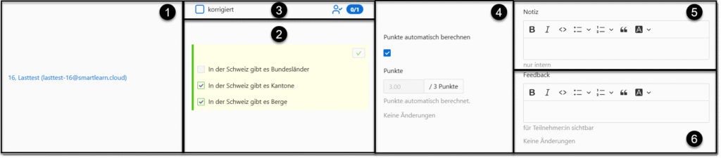 5 | Im Feld Feedback können Informationen zur Korrektur an die Teilnehmenden weitergegeben werden. Diese Notizen sind für die Teilnehmenden nach Rückgabe der Resultate ersichtlich. |