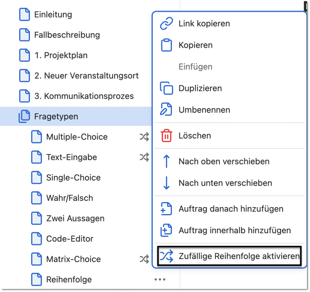 - Wird hingegen die zufällige Reihenfolge ausgewählt, bleibt diese für Autor:innen im Auftragseditor identisch, ist aber für Teilnehmende zufällig
