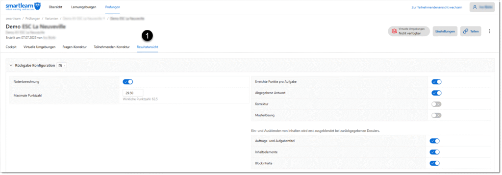 Teilnehmende können die korrigierten Prüfungen innerhalb von smartlearn zurückerhalten. Nach Abschluss der Korrektur einer Durchführung können Sie über das Cockpit im Register «Resultatansicht» in die Einstellungen der Rückgabe wechseln.