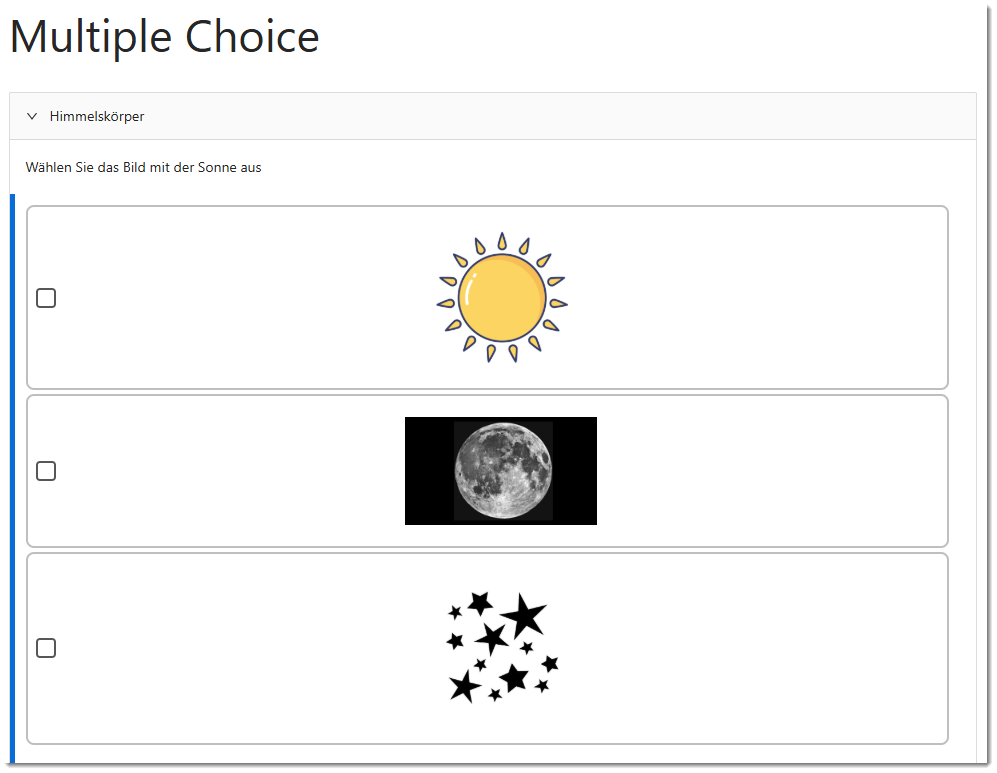 Um es Autor:innen zu ermöglichen, den Multiple-Choice-Block vielfältiger nutzen zu können (beispielsweise mit Bildern), wurde dieser Block optisch verbessert.